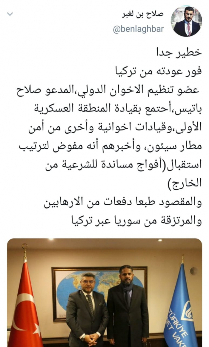 وقال بن لغبر عبر تغريدة له على "تويتر" رصدها "المشهد العربي": "خطير جدا، فور عودته من تركيا، عضو تنظيم الإخوان الدولي المدعو صلاح باتيس، اجتمع بقيادة المنطقة العسكرية الأولى، وقيادات إخوانية وأخرى من أمن مطار سيئون، وأخبرهم أنه مفوض لترتيب استقبال (أفواج مساندة للشرعية من الخارج)".