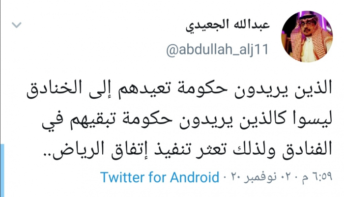 وكتب الجعيدي عبر تغريدة له على "تويتر" رصدها "المشهد العربي": "الذين يريدون حكومة تعيدهم إلى الخنادق ليسوا كالذين يريدون حكومة تبقيهم في الفنادق ولذلك تعثر تنفيذ اتفاق الرياض".