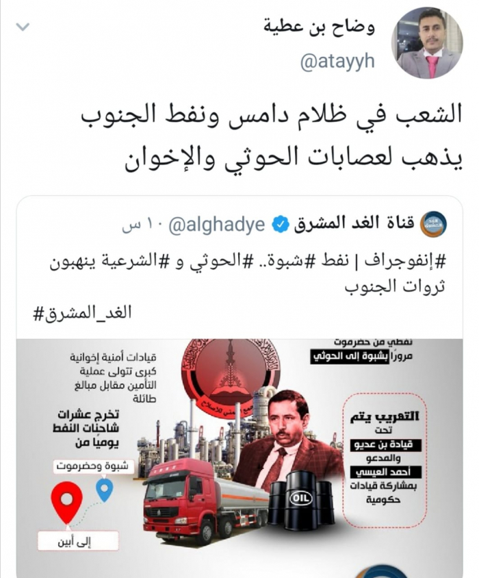 هاجم عضو الجمعية الوطنية الجنوبية، وضاح بن عطية، مليشيات الحوثي والإخوان الإرهابية بسبب استيلائهم على نفط الجنوب.