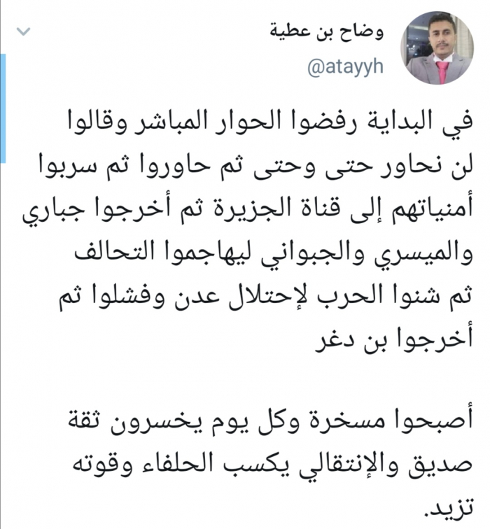 وأضاف بن عطية :"أصبحوا مسخرة وكل يوم يخسرون ثقة صديق والانتقالي يكسب الحلفاء وقوته تزيد".