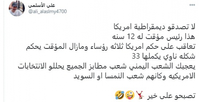 وقال في تغريدة عبر "تويتر" رصدها "المشهد العربي": "لا تصدقوا ديمقراطية أمريكا هذا رئيس مؤقت له 12 سنة تعاقب على حكم أمريكا ثلاثه رؤساء وما زال المؤقت يحكم شكله ناوي يكملها 33 ".