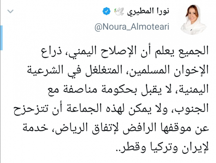 وقالت المطيري في تغريدة لها عبر حسابها بتويتر ورصدها "المشهد العربي": "الجميع يعلم أن الإصلاح اليمني، ذراع الإخوان المسلمين، المتغلغل في الشرعية اليمنية، لا يقبل بحكومة مناصفة مع الجنوب، ولا يمكن لهذه الجماعة أن تتزحزح عن موقفها الرافض لاتفاق الرياض".