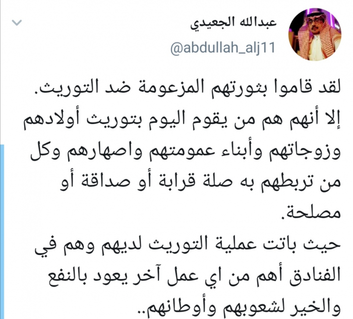 وقال الجعيدي عبر تغريدة له على "تويتر" رصدها "المشهد العربي": "لقد قاموا بثورتهم المزعومة ضد التوريث إلا أنهم هم من يقوم اليوم بتوريث أولادهم وزوجاتهم وأبناء عمومتهم وأصهارهم وكل من تربطهم به صلة قرابة أو صداقة أو مصلحة".