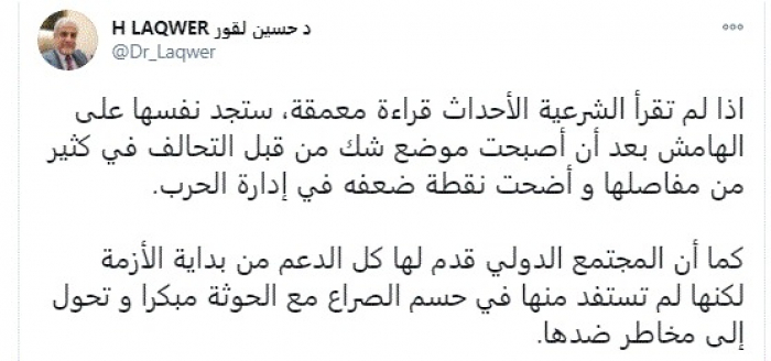 وقال في تغريدة عبر "تويتر" رصدها "المشهد العربي": "إذا لم تقرأ الشرعية الأحداث قراءة معمقة، ستجد نفسها على الهامش بعد أن أصبحت موضع شك من قبل التحالف في كثير من مفاصلها وأضحت نقطة ضعفه في إدارة الحرب".