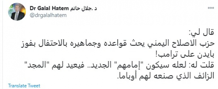 وكتب في تغريدة عبر "تويتر" رصدها "المشهد العربي": "قال لي: حزب الإصلاح ليمني يحث قواعده وجماهيره بالاحتفال بفوز بايدن على ترامب! قلت له: لعله سيكون إمامهم الجديد.. فيعيد لهم المجد الزائف الذي صنعه لهم أوباما".