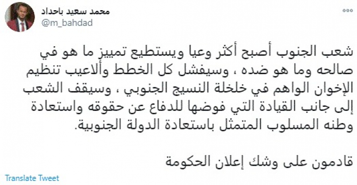 وكتب في تغريدة عبر "تويتر" رصدها "المشهد العربي": "شعب الجنوب أصبح أكثر وعيًا ويستطيع تمييز ما هو في صالحه وما هو ضده، وسيفشل كل الخطط وألاعيب تنظيم الإخوان الواهم في خلخلة النسيج الجنوبي".