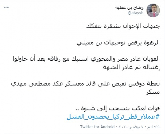 وكتب "بن عطية" تغريدة عبر تويتر، رصدها "المشهد العربي": "جبهات الإخوان بشقرة تتفكك، الرهوة يرفض توجيهات بن معيلي، العوبان غادر مصر والمحوري اشتبك مع رفاقه بعد أن حاولوا اغتياله ثم غادر الجبهة".