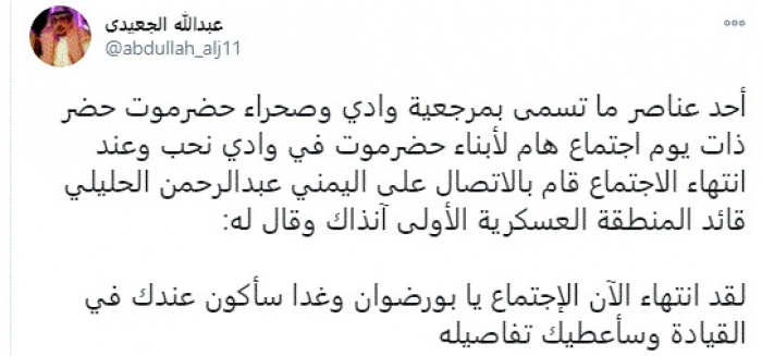 وكتب في تغريدة عبر "تويتر" رصدها "المشهد العربي": "أحد عناصر ما تسمى بمرجعية وادي وصحراء حضرموت حضر ذات يوم اجتماع هام لأبناء حضرموت في وادي نحب وعند انتهاء الاجتماع قام بالاتصال على اليمني عبدالرحمن الحليلي قائد المنطقة العسكرية الأولى آنذاك وقال له: لقد انتهاء الآن الاجتماع يا بو رضوان وغدًا سأكون عندك في القيادة وسأعطيك تفاصيله".