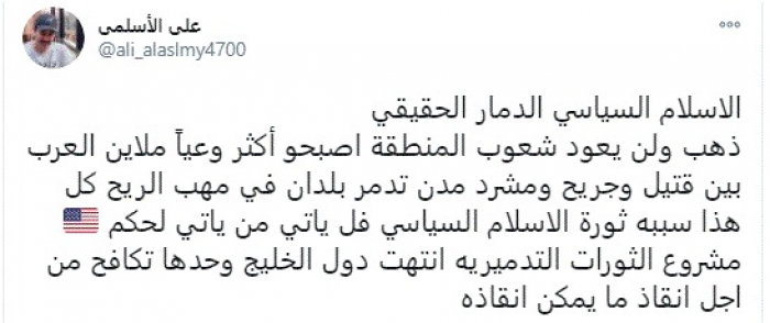وصف الناشط السياسي علي الأسلمي، اليوم، الإسلام السياسي بالدمار، مؤكدًا أنه ذهب ولن يعود، جراء زيادة الوعي لدى شعوب المنطقة العربية.