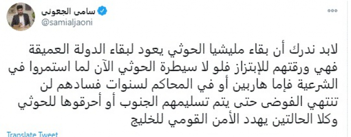 وكتب في تغريدة عبر "تويتر" رصدها "المشهد العربي": "لا بد ندرك أن بقاء مليشيا الحوثي يعود لبقاء الدولة العميقة فهي ورقتهم للابتزاز فلولا سيطرة الحوثي الآن لما استمروا في الشرعية فإما هاربين أو في المحاكم لسنوات فسادهم، لن تنتهي الفوضى حتى يتم تسليمهم الجنوب أو أحرقوها للحوثي وكلا الحالتين يهدد الأمن القومي".