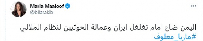 هاجمت الإعلامية اللبنانية ماريا معلوف، اليوم، مليشيات الحوثي الإرهابية، مؤكدةً ضياع اليمن بسبب عمالة الحوثيين لنظام الملالي الإيراني.