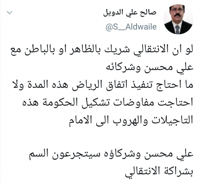 وقال الدويل في تغريدة له عبر "تويتر" رصدها "المشهد العربي": "لو أن الانتقالي شريك بالظاهر أو بالباطن مع علي محسن وشركائه ما احتاج تنفيذ اتفاق الرياض هذه المدة ولا احتاجت مفاوضات تشكيل الحكومة هذه التأجيلات والهروب إلى الإمام".
