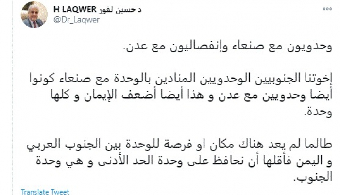 وقال في تغريدة عبر "تويتر" رصدها "المشهد العربي": "وحدويون مع صنعاء وانفصاليون مع عدن. إخوتنا الجنوبيين الوحدويين المنادين بالوحدة مع صنعاء كونوا أيضًا وحدويين مع عدن وهذا أيضًا أضعف الإيمان وكلها وحدة".