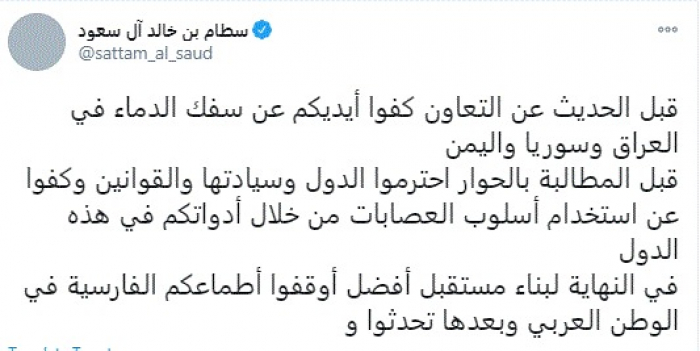 رد الأمير السعودي البارز سطام بن خالد آل سعود، على دعوة وزير الخارجية الإيراني محمد جواد ظريف للدول العربية للحوار مع طهران، مُطالبًا نظام الملالي بالكف عن سفك الدماء واحترام سيادة الدول قبل المطالبة بالحوار.