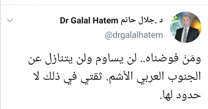 وقال حاتم في تغريدة له عبر حسابه بتويتر ورصدها "المشهد العربي": "ومَنْ فوضناه.. لن يساوم ولن يتنازل عن الجنوب العربي الأشم ثقتي في ذلك لا حدود لها"