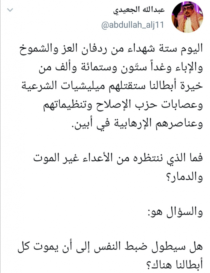 وقال الجعيدي عبر تغريدة له على "تويتر" رصدها "المشهد العربي": "اليوم ستة شهداء من ردفان العز والشموخ والإباء وغدا ستّون وستمائة وألف من خيرة أبطالنا ستقتلهم مليشيات الشرعية وعصابات حزب الإصلاح وتنظيماتهم وعناصرهم الإرهابية في أبين".