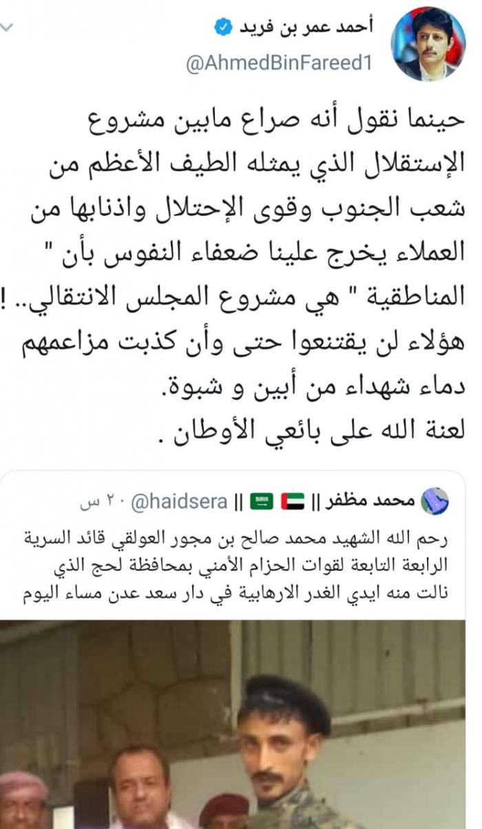 وأشار بن فريد إلى أن "هؤلاء لن يقتنعوا حتى وأن كذبت مزاعمهم دماء شهداء من أبين و شبوة"، مختتما تغريدته" لعنة الله على بائعي الأوطان".