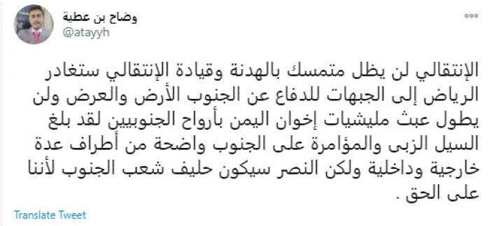 وكتب في تغريدة عبر "تويتر" رصدها "المشهد العربي": "الانتقالي لن يظل متمسك بالهدنة وقيادة الانتقالي ستغادر الرياض إلى الجبهات للدفاع عن الجنوب الأرض والعرض".