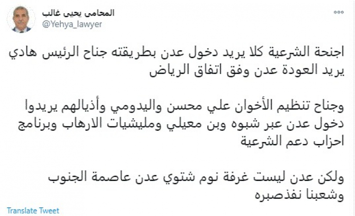 وجه الناشط السياسي المحامي يحيى غالب، اليوم، انتقادًا لاذعًا للرئيس اليمني المؤقت عبدربه منصور هادي وحكومة الشرعية وقيادات جماعة الإخوان الإرهابية باليمن جراء محاولاتهم دخول العاصمة عدن.