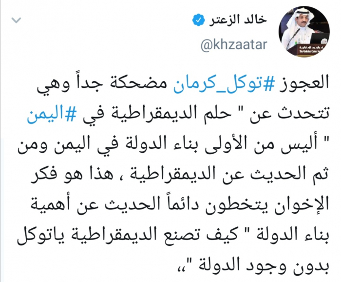 وقال الزعتر عبر تغريدة له على "تويتر" رصدها "المشهد العربي": "العجوز توكل كرمان مضحكة جدا وهي تتحدث عن حلم الديمقراطية في اليمن".