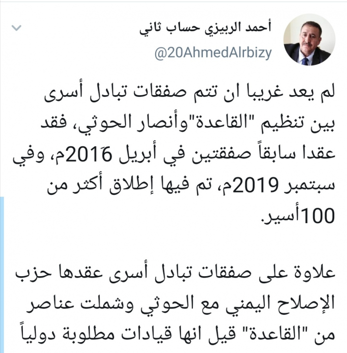 وقال الربيزي في تغريدة عبر "تويتر" رصدها "المشهد العربي": "لم يعد غريبا أن تتم صفقات تبادل أسرى بين تنظيم "القاعدة"وأنصار الحوثي، فقد عقدا سابقا صفقتين في أبريل 201ََ6م، وفي سبتمبر 2019م، تم فيها إطلاق أكثر من 100أسير".
