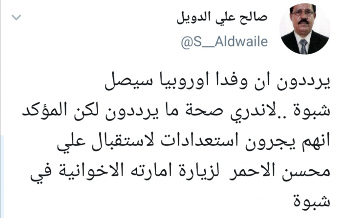 وكتب الدويل في تغريدة له عبر "تويتر" رصدها "المشهد العربي": "يرددون أن وفدا أوروبيا سيصل شبوة ..لا ندري صحة ما يرددون لكن المؤكد أنهم يجرون استعدادات لاستقبال علي محسن الأحمر لزيارة إمارته الإخوانية في شبوة".