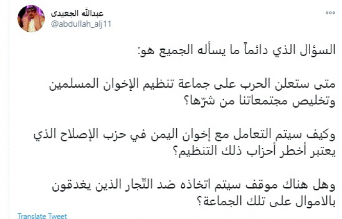 وقال في تغريدة عبر "تويتر" رصدها "المشهد العربي": "السؤال الذي دائمًا ما يسأله الجميع هو: متى ستعلن الحرب على جماعة تنظيم الإخوان المسلمين وتخليص مجتمعاتنا من شرّها؟".