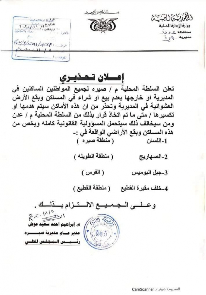 حذرت مديرية صيرة بالعاصمة عدن، جميع المواطنين من بيع وشراء مساكن في بعض المناطق العشوائية.