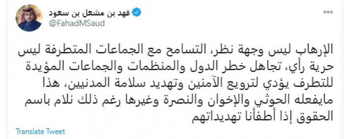 طالب الأمير السعودي البارز فهد بن مشعل بن مسعود، اليوم، بمواجهة الإرهاب بكل قوة، مستنكرًا بعض الأصوات التي تنادي بعدم مجابهة التنظيمات الإرهابية مثل الإخوان ومليشيات الحوثي وجبهة النصرة.