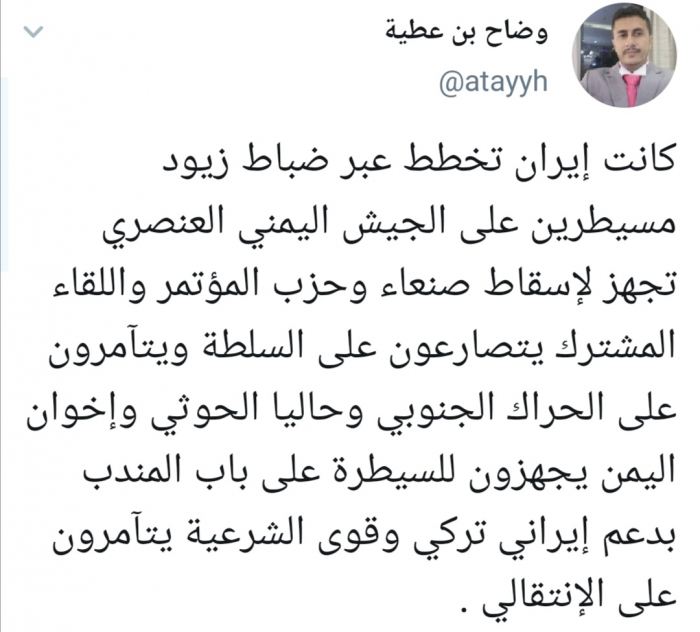 وكتب بن عطية عبر تغريدة له على "تويتر" رصدها " المشهد العربي": "كانت إيران تخطط عبر ضباط زيود مسيطرين على الجيش اليمني العنصري تجهز لإسقاط صنعاء وحزب المؤتمر واللقاء المشترك يتصارعون على السلطة ويتآمرون على الحراك الجنوبي".