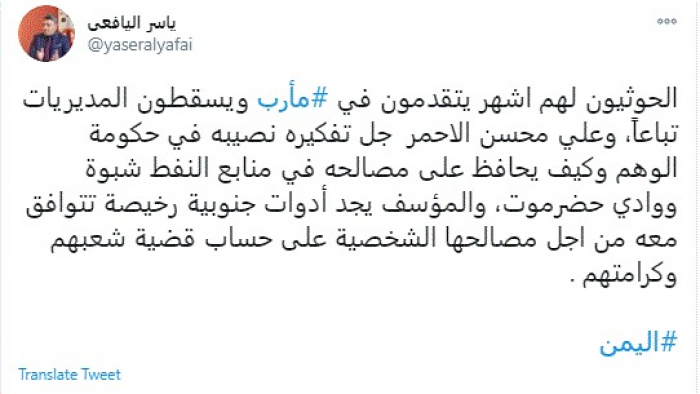 وقال في تغريدة عبر "تويتر" رصدها "المشهد العربي": "الحوثيون لهم أشهر يتقدمون في مأرب ويسقطون المديريات تباعًا، وعلي محسن الأحمر جل تفكيره نصيبه في حكومة الوهم وكيف يحافظ على مصالحه في منابع النفط بشبوة ووادي حضرموت".