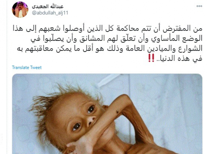 وقال في تغريدة عبر "تويتر" رصدها "المشهد العربي": "من المفترض أن تتم محاكمة كل الذين أوصلوا شعبهم إلى هذا الوضع المأساوي وأن تعلّق لهم المشانق وأن يصلّبوا في الشوارع والميادين العامة وذلك هو أقل ما يمكن معاقبتهم به في هذه الدنيا".