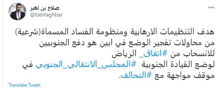 وكتب في تغريدة عبر "تويتر" رصدها "المشهد العربي": "هدف التنظيمات الإرهابية ومنظومة الفساد المسماة (شرعية) من محاولات تفجير الوضع في أبين هو دفع الجنوبيين للانسحاب من اتفاق الرياض".