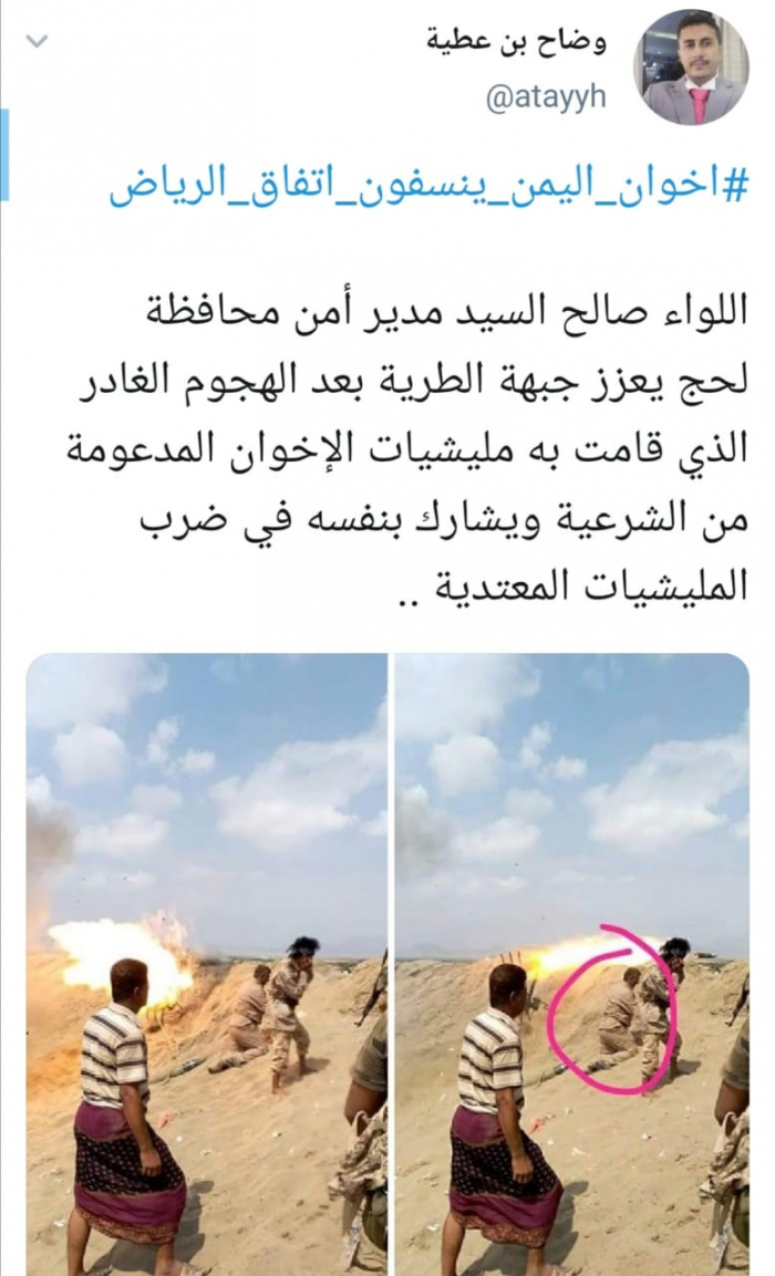 وقال بن عطية عبر تغريدة له على "تويتر" رصدها " المشهد العربي": "اللواء صالح السيد مدير أمن محافظة لحج يعزز جبهة الطرية بعد الهجوم الغادر الذي قامت به مليشيات الإخوان المدعومة من الشرعية ويشارك بنفسه في ضرب المليشيات المعتدية".