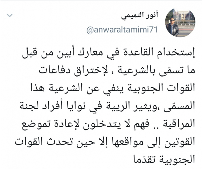 وقال التميمي في تغريدة له عبر حسابه بتويتر ورصدها "المشهد العربي": "استخدام القاعدة في معارك أبين من قبل ما تسمّى بالشرعية، لإختراق دفاعات القوات الجنوبية ينفي عن الشرعية هذا المسمّى ويثير الريبة في نوايا أفراد لجنة المراقبة".