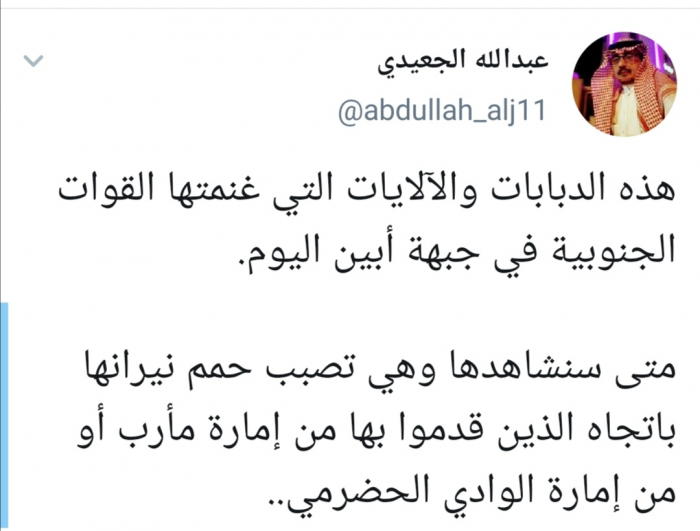 وقال الجعيدي عبر حسابه في تويتر ورصدها "المشهد العربي": "هذه الدبابات والآليات التي غنمتها القوات الجنوبية في جبهة أبين اليوم متى سنشاهدها وهي تصبب حمم نيرانها باتجاه الذين قدموا بها من إمارة مأرب أو من إمارة الوادي الحضرمي".