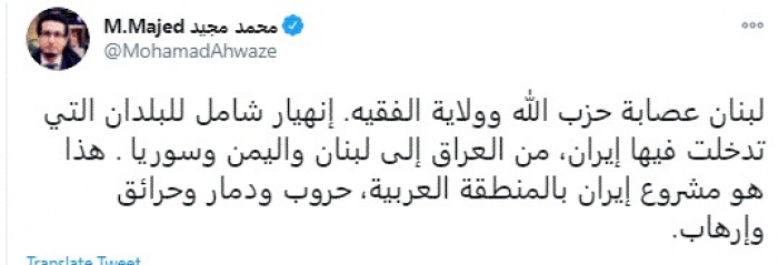 وكتب في تغريدة عبر "تويتر" رصدها "المشهد العربي": "لبنان عصابة حزب الله وولاية الفقيه. إنهيار شامل للبلدان التي تدخلت فيها إيران، من العراق إلى لبنان واليمن وسوريا . هذا هو مشروع إيران بالمنطقة العربية، حروب ودمار وحرائق وإرهاب".