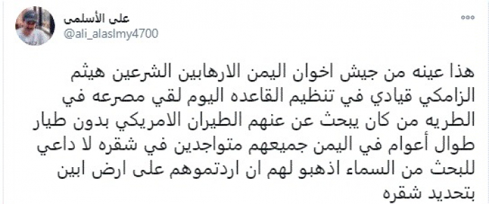 وقال في تغريدة عبر "تويتر" رصدها "المشهد العربي": "هذا عينة من جيش إخوان اليمن الإرهابيين الشرعيين هيثم الزامكي قيادي في تنظيم القاعدة لقي مصرعه في الطرية من كان يبحث عن عنهم الطيران الأمريكي بدون طيار طوال أعوام في اليمن جميعهم متواجدين في شقرة".