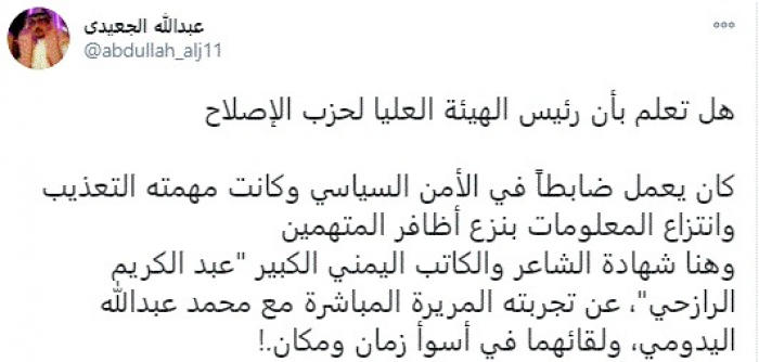 وقال في تغريدة عبر "تويتر" رصدها "المشهد العربي": "هل تعلم بأن رئيس الهيئة العليا لحزب الإصلاح كان يعمل ضابطاً في الأمن السياسي وكانت مهمته التعذيب وانتزاع المعلومات بنزع أظافر المتهمين".