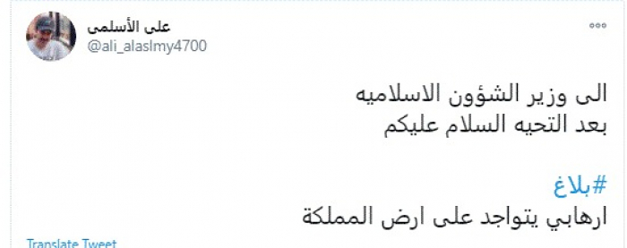 وقال في تغريدة عبر "تويتر" رصدها "المشهد العربي": "إلى وزير الشؤون الإسلامية بعد التحية السلام عليكم بلاغ إرهابي يتواجد على أرض المملكة".