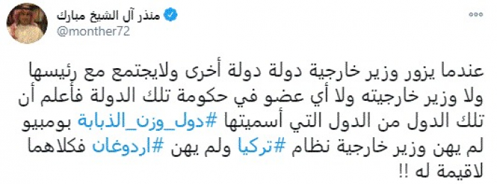 علق المدون السعودي البارز منذر آل الشيخ مبارك، اليوم، على إهانة وزير الخارجية الأمريكي مايك بومبيو لنظام الرئيس التركي رجب طيب أردوغان.