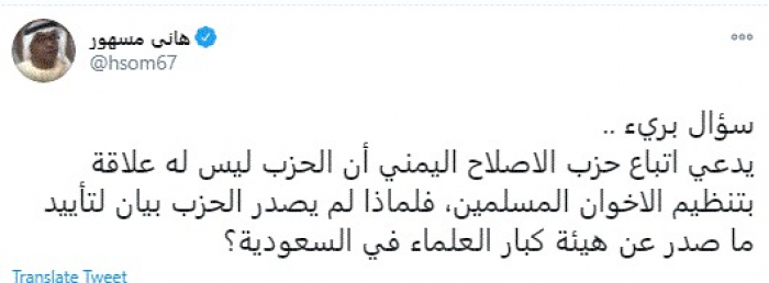 وقال في تغريدة عبر "تويتر" رصدها "المشهد العربي": "سؤال بريء.. يدعي أتباع حزب الاصلاح اليمني أن الحزب ليس له علاقة بتنظيم الاخوان المسلمين، فلماذا لم يصدر الحزب بيان لتأييد ما صدر عن هيئة كبار العلماء في السعودية؟
