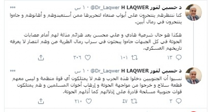وكتب "لقور" تغريدة عبر تويتر، رصدها "المشهد العربي": "كنا ننتظرهم ينتحرون على أبواب صنعاء لتحريرها ممن استعبدوهم و أهانوهم و جاءوا ينتحرون في رمال أبين".