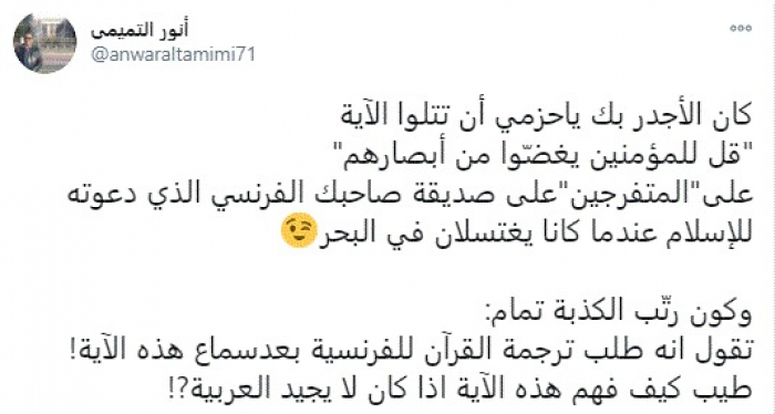 جاء ذلك في مجمل رد "التميمي" على "الحزمي" بعد نشره لتغريدة زعم فيها أن فرنسي طلب منه ترجمة القرآن الكريم باللغة الفرنسية بعد سماع آية قرآنية منه.
