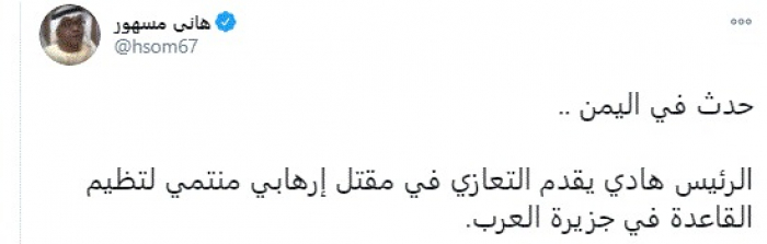 وقال في تغريدة عبر "تويتر" رصدها "المشهد العربي": "حدث في اليمن.. الرئيس هادي يقدم التعازي في مقتل إرهابي منتمي لتنظيم القاعدة في جزيرة العرب".