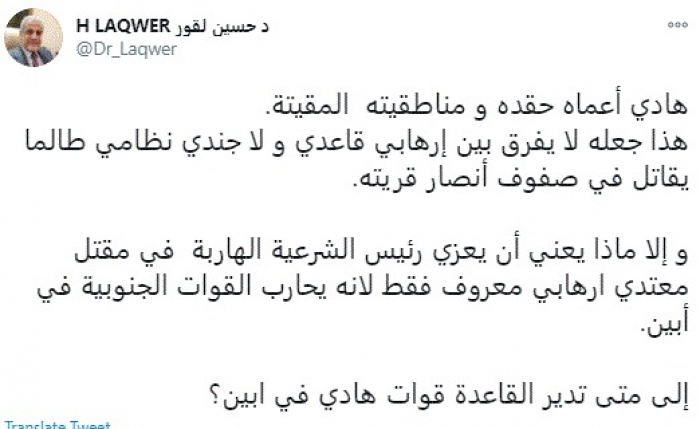 وقال في تغريدة عبر "تويتر" رصدها "المشهد العربي": "هادي أعماه حقده ومناطقيته المقيتة. هذا جعله لا يفرق بين إرهابي قاعدي ولا جندي نظامي طالما يقاتل في صفوف أنصار قريته".