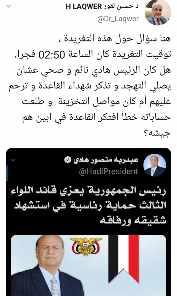 وقال لقور في تغريدة له عبر "تويتر" رصدها "المشهد العربي": "هنا سؤال حول هذه التغريدة، توقيت التغريدة كان الساعة 02:50 فجرا هل كان الرئيس هادي نائما و صحي عشان يصلي التهجد وتذكر شهداء القاعدة وترحم عليهم أم كان مواصل التخزينة وطلعت حساباته خطأ افتكر القاعدة في أبين هم جيشه"؟