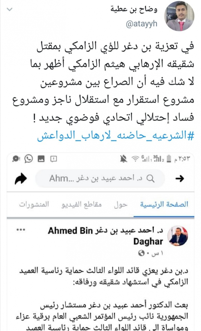 استنكر عضو الجمعية الوطنية الجنوبية، وضاح بن عطية، تعزية مستشار الرئيس اليمني المؤقت المحال للتحقيق بتهم فساد المدعو أحمد بن دغر للإرهابي المدعو لؤي الزامكي قائد اللواء الثالث حماية رئاسية في مقتل شقيقه.