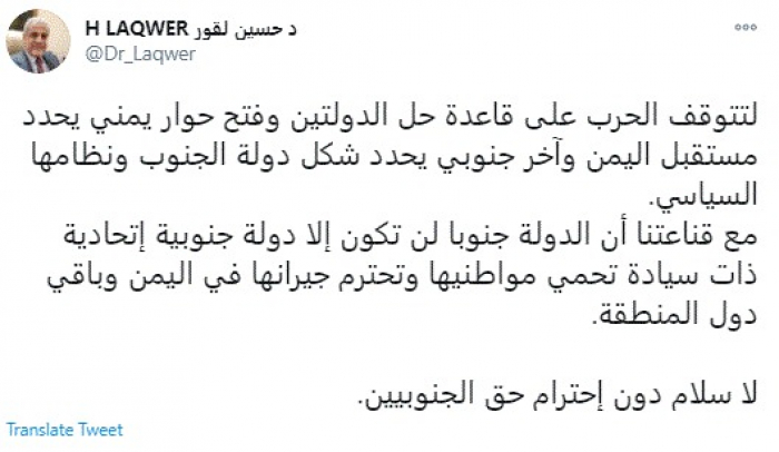وقال في تغريدة عبر "تويتر" رصدها "المشهد العربي": "لتتوقف الحرب على قاعدة حل الدولتين وفتح حوار يمني يحدد مستقبل اليمن وآخر جنوبي يحدد شكل دولة الجنوب ونظامها السياسي".