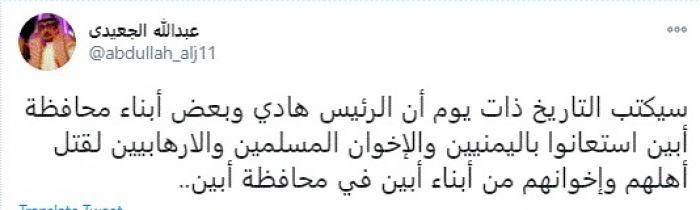 وكتب في تغريدة عبر "تويتر" رصدها "المشهد العربي": "سيكتب التاريخ ذات يوم أن الرئيس هادي وبعض أبناء محافظة أبين استعانوا باليمنيين والإخوان المسلمين والإرهابيين لقتل أهلهم وإخوانهم من أبناء أبين في محافظة أبين".